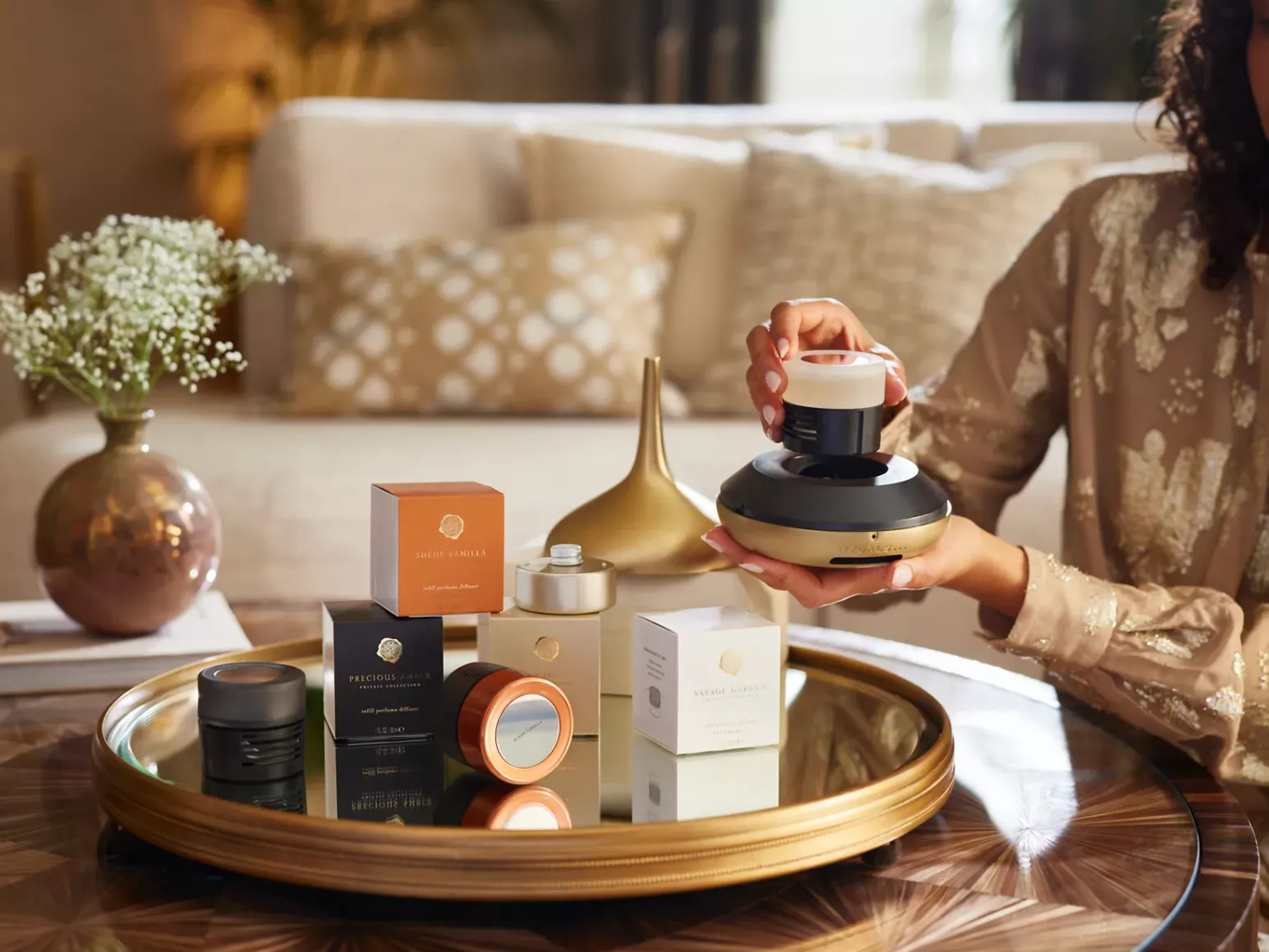 Sumérgete en el aroma dulce y sensual de nuestro lujoso perfume para el hogar Precious Amber, una suntuosa mezcla aromática de ylang ylang, pachulí, vetiver y ámbar. Introduce el cartucho en tu Perfume Genie y crea tu programa personal.