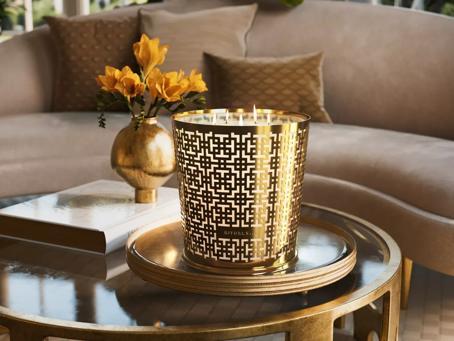 Calma tus sentidos con una mezcla aromática de notas cálidas y amaderadas y el toque intenso del pachulí y las especias, gracias a la vela aromática Black Oudh con un portavelas en metal dorado.