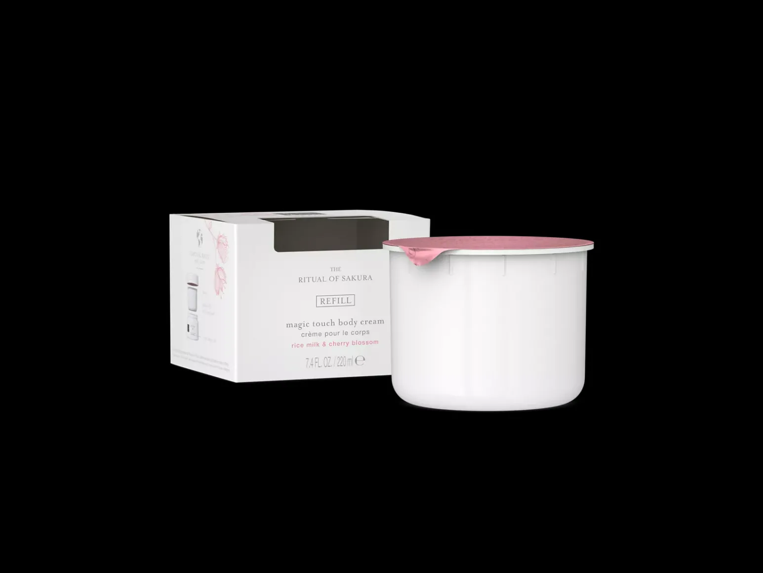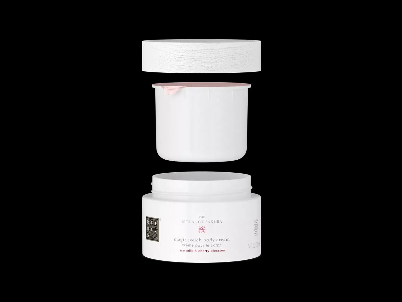 No tires el envase de tu crema corporal: rellénalo con esta práctica recarga. Contiene la misma fórmula lujosa y el mismo aroma de flor de cerezo que tanto te gustan, pero con menos envoltorio.