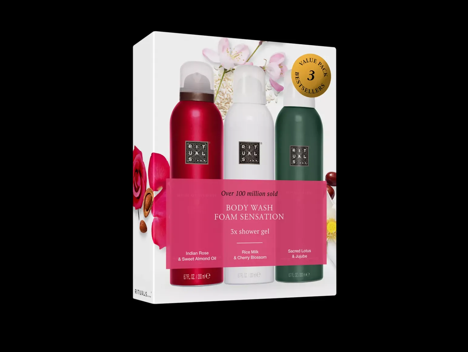 The Ritual of Ayurveda Foaming Shower Gel: Aqua/Water, Sodium Coco-Sulfate, Decyl Glucoside, Isopentane, Coco-Glucoside, Glycerin, PEG-120 Methyl Glucose Dioleate, Isopropyl Palmitate, Parfum/Fragrance, Isobutane, Rosa Damascena Flower Oil, Prunus Amygdalus Dulcis (Sweet Almond) Oil, Citric Acid, Sodium Benzoate, Guar Hydroxypropyltrimonium Chloride, Hexyl Cinnamal, Limonene, Linalool, Coumarin, Citronellol, Benzyl Benzoate.The Ritual of Jing Foaming Shower Gel: Aqua/Water, Sodium Laureth Sulfate, Cocamidopropyl Betaine, Isopentane, Sorbitol, Parfum/Fragrance, Isopropyl Palmitate, Isobutane, PEG-120 Methyl Glucose Dioleate, Glycerin, Butylene Glycol, Nelumbo Nucifera (Lotus) Flower Extract, Ziziphus Jujuba (Jujube) Fruit Extract, Sodium Benzoate, Potassium Sorbate, Sodium Chloride, PEG-40 Hydrogenated Castor Oil, Citric Acid, Guar Hydroxypropyltrimonium Chloride, Tocopherol, Alpha-Isomethyl Ionone, Benzyl Salicylate, Hexyl Cinnamal, Linalool.The Ritual of Sakura Foaming Shower Gel: Aqua/Water, Sodium Laureth Sulfate, Cocamidopropyl Betaine, Isopentane, Sorbitol, PEG-120 Methyl Glucose Dioleate, Isopropyl Palmitate, Parfum/Fragrance, Isobutane, Oryza Sativa (Rice) Extract, Prunus Cerasus (Bitter Cherry) Extract, Sodium Benzoate, Citric Acid, PEG-40 Hydrogenated Castor Oil, Butylene Glycol, Glycerin, Guar Hydroxypropyltrimonium Chloride, Potassium Sorbate, Sorbic Acid, Hexyl Cinnamal, Benzyl Salicylate, Linalool, Coumarin, Citronellol, Geraniol, Alpha-Isomethyl Ionone, Cinnamyl Alcohol.