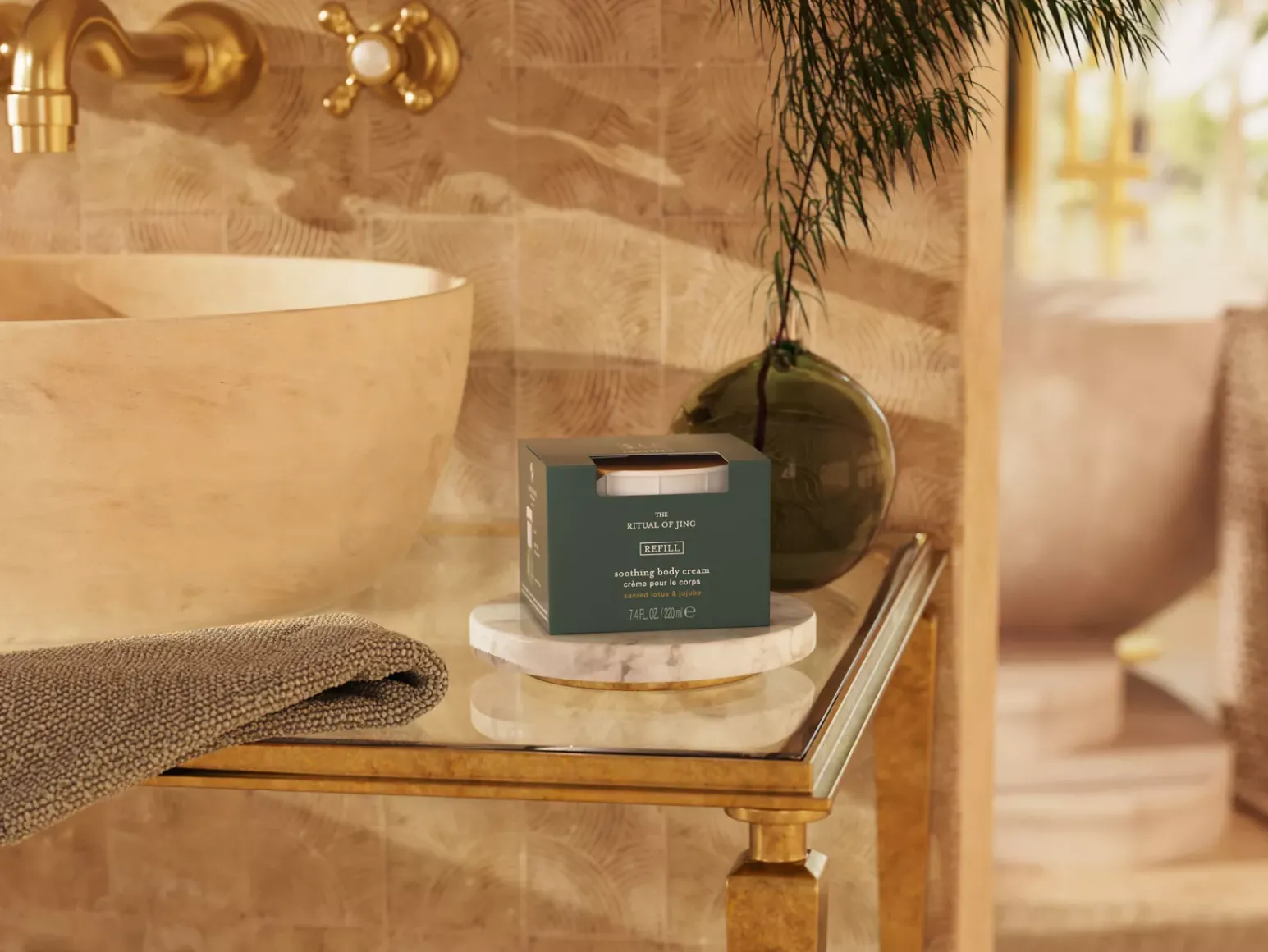 Cuando se vacíe el frasco de crema corporal de The Ritual of Jing, elige la opción de recarga. La crema densa e hidratante, que combina la fragancia floral y cálida de la flor de loto con el poder relajante del jinjolero, te deja la piel suave como la seda. Cabe a la perfección en el envase original de lujo.
