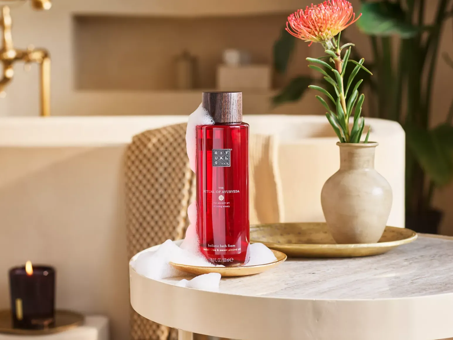 Relájate con esta lujosa espuma de baño con una maravillosa mezcla de tesoros ayurvédicos. El aceite de almendras dulces y la esencia de la rosa de la India suavizan la piel y relajan los sentidos.